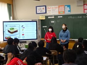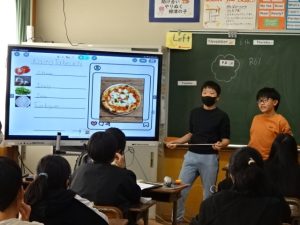 6年生、英語の授業の様子です。テレビに映した食べ物に使われている食材がどの国のものなのかを英語でスピーチしていました。堂々としていてかっこよかったです。前回、アイコンタクトが課題だったようですが、今日の発表では、しっかりと顔を上げて仲間の方を見て発表でいていました。美しい発音に、思わず聞き入ってしまいました。すごいなぁ~。