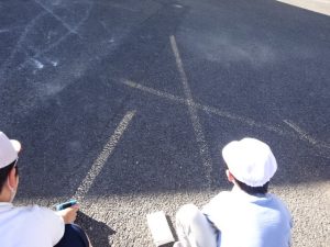 3年生理科「太陽の光」です。鏡に当たった日光がどのように進んでいくのかを、自分たちが考えた方法で確かめました。鏡を置く場所を工夫すると、鏡に当たった光が地面に映り、光がまっすぐに進んでいることを確かめることができました。