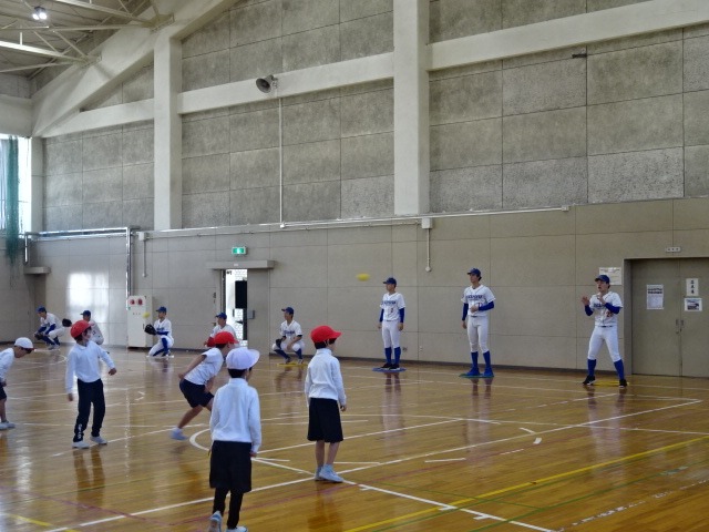 「野球」東海学院大学 硬式野球部のみなさんが、球の投げ方を教えてくださいました。相手のグローブを狙って、または的を狙って、上手に投げることができるようになりました。