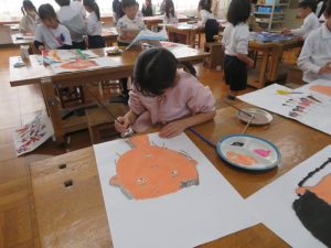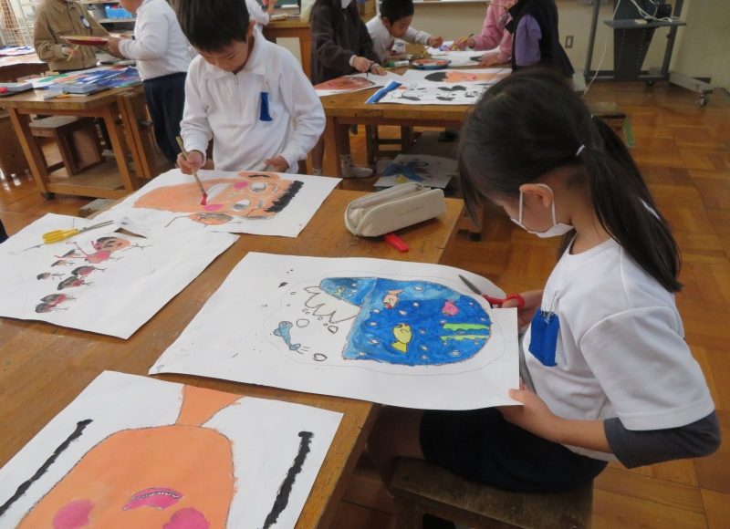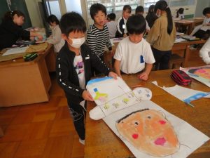 大きな画用紙いっぱいに自分の顔を描き、絵の中の自分に、想像した自分だけのすてきな帽子をかぶせていました。それぞれみんな違って、とっても楽しい図工の時間でした。どんなすてきな帽子ができあがるのかな~