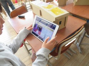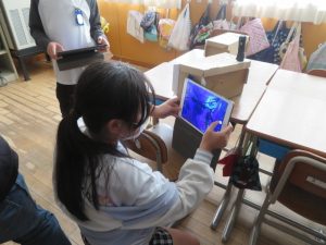 5年生図工「のぞいてみると」の作品鑑賞の様子です。完成した友達の作品を実際に覗いてみてタブレットで撮影し、作品のよさについて記述していました。はじめは、箱の中を覗いても真っ暗ですが、ライトの光が差し込むとぱあ~っと美しい世界が広がります。思わず「お~っ!!!」と感動の声が漏れていました。