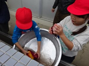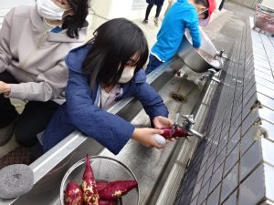 むらさきはなな学級の子どもたちが、先日収穫した「さつまいも」で調理実習をしました。はじめに、収穫したサツマイモについている土を丁寧に洗い流しました。今日は、昨日よりも気温が低く、水道の水がとても冷たく感じます。それでも、おいしく食べられるように、ゴシゴシゴシ・・・