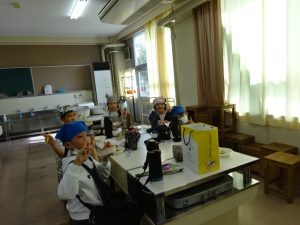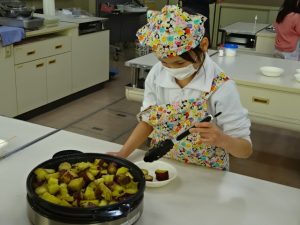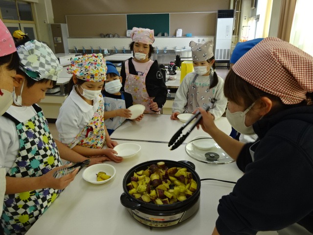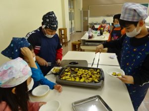 食べやすい大きさに切った後、ホットプレートの上で蒸し焼きにしました。「大学いも」を作る予定だったようですが、苦手な子がいるということで、ふかし芋に変更!自分で好きな味つけをしていました。