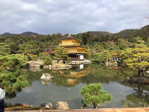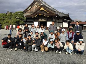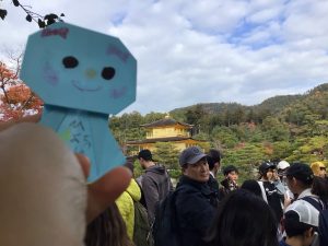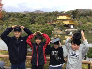 1年生の子が作ってくれたてるてる坊主の効果もあり、爽やかな秋晴れの京都で歴史的名所を巡りました。金閣寺では、その圧倒的な美しさに感動!池の水面に映る金閣寺もバッチリ見ることができました。
