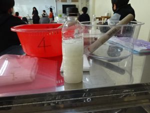 たらいに水を入れて、その中にペットボトルに入っていたとろとろの液体を流し込みました。軽く手でかき混ぜて・・・それを紙すきの道具ですくい上げます。斜めに入れてそっと持ち上げるというこつをよーく聞いて、慎重に紙を漉いていきます。何度もやり直せるので安心してチャレンジできます。