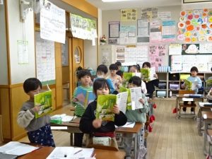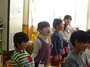 1回みんなで読んだだけで、教科書を持たなくても大きな声で読める子ばかり。口をしっかりと開けて、楽しく練習できました。ステップを踏みながら読んでいる子もいました。
