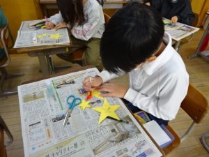 はじめに、星形に黄色の画用紙を切って、フラワーアレンジメントに飾るピックを作成しました。大きい星のピックと小さい星のピックがあり、大きい方にはメッセージを入れました。「メリークリスマス!」とか「いつもありがとう」など、思い思いのメッセージを、渡す方の顔を思い浮かべながら丁寧に作っていました。