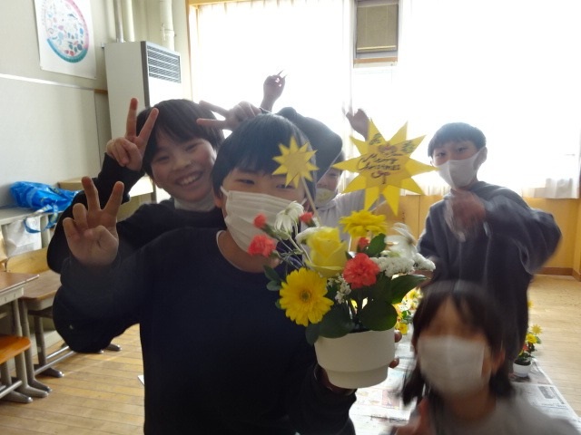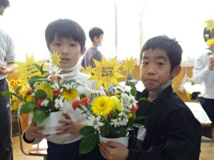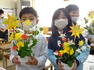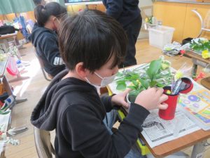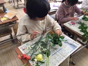 4年生の子どもたちが、日本フラワー協会の方々にお越しいただき、フラワーアレンジメント講座を行っていただきました。パンジーとキンセンカの種まきから、花を育てる活動につて教えてくださっている協会の方々です。今日は、その活動の一つとして『フラワーアレンジメント』を一人一人が体験させていただきました