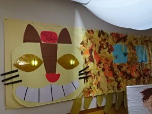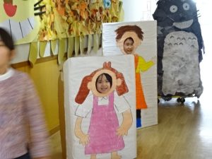 むらさきはなな1組のジブリパーク、今日は3年生の子どもたちが招待されました。壁に貼られたネコバスの目はキラーンと光っていました。子どもの身長以上の大きさもある大きなトトロや、顔を出すことができるメイやサツキの人形があって、むらさきはなな1組の廊下が、とっても楽しいコーナーとなっていました。これから、いろいろな学年が順に招待されていく予定のようですよ。