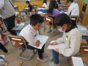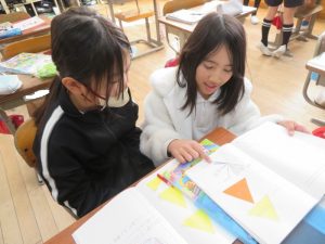 3年生の算数です。ノートを見せながら、仲間に説明をしています。どの部分説明をしているのか指し示しながら、また、相手の反応を確かめながら、とっても上手に説明をしていました。