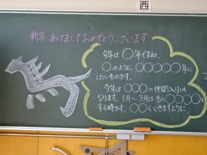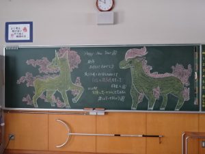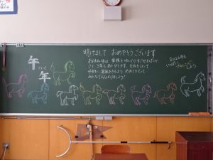朝は、全員が体育館に入場して集会からスタートしました。新年のあいさつとともに、「今年も自分の可能性を信じてがんばってほしい」と校長先生からお話を聞きました。お話の中で、今年の干支である「馬」は速く遠くまで走ることができる昔からの大切な交通手段ではあるけれど、馬も速く遠くまで走ることができるようになるには日々の練習の積み重ねが必要だと教えていただきました。どんなことでも、やはり努力を積み重ねないと最大の力は発揮できないということですね。6年生の子どもたちにとっては、慣れ親しんだ小学校を卒業し、中学校という新しい場所に生活の本拠地を移していく特別な年の始まりでもあります。どんな気持ちで今朝は登校したのかなぁ。いつになく真剣に話を聞く姿に新年の決意を感じました。