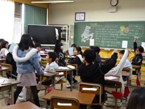 4年生、冬休み中の自分の生活に関わるクイズを仲間に出し、そのクイズに○×で答えるというゲームをして盛り上がっていました。○なら青い紙、×なら赤い紙を上にあげて、当たるたびに「イェーイ!」と大喜びでした。クイズに答えながら、離れていた期間の友だちの様子も分かって面白いですね。