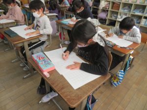 2年生は書き初めをしていました。冬休みにも練習したのかな。背筋をピンと伸ばして丁寧に書いていました。ちょっと張り詰めた緊張感が、まさに新年の始まりにふさわしい感じでした。きっと、頭の中に「今年はこれをがんばりたいな」という願いを思い浮かべて書いていたことと思います。