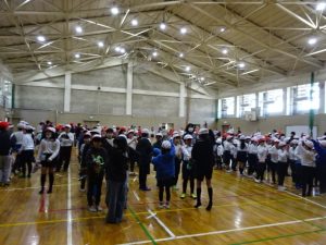 体育館に入ってからは、学級ごとに整列し、人数の確認を行いました。先生の指示がなくても、人数が数えやすいように隣の子と列を揃えて並ぶことができました。
