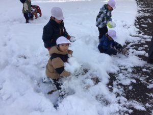 今日の雪はふわふわさらさらの雪で、真っ白に染まった緑道公園を前に子どもたちのテンションは爆上がりでした!雪だるまを作ったり、雪合戦をしたり・・・。やわらかい雪なので、雪玉が当たっても痛くないですね。