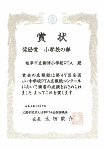 柳津小学校のPTA広報誌が、『第47回 全国小・中学校PTA広報誌コンクール』で奨励賞に選ばれました。広報委員会の皆様、おめでとうございます!!!