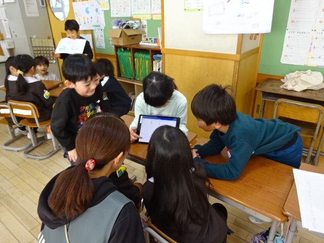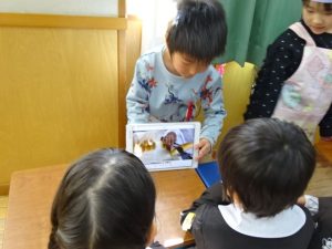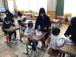 今日は、幼稚園の年長さんたちが柳津小学校1年生の生活科の授業に来てくれました。2月初旬の入学説明会で行った柳津小学校の生活の生活について画像を見せたり実物を用意したりして説明していました。願いは、『入学が楽しみになるように』です。