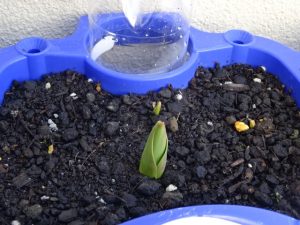 日中は、ぽかぽか暖かくなってきました。中庭に置いてある1年生の植木鉢からは、チューリップのかわいらしい芽が、ひょっこり頭を出していました。春が近づいているのを感じますね。