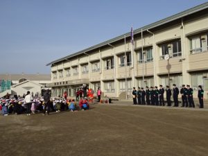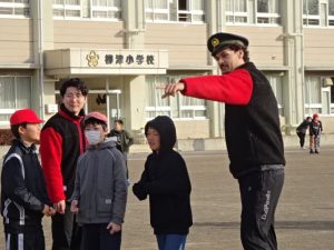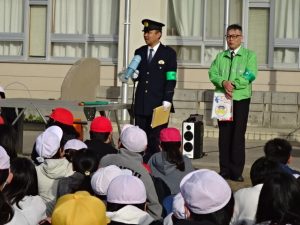 柳津小支援推進委員会のご尽力により、「警察官(羽島警察署)と遊ぼう」のイベントが実施されました。1日目の今日は4年生と5年生の子どもたちが対象で、8時15分の開始時刻には運動場に集合し始まりました。