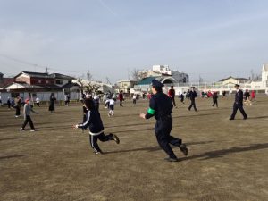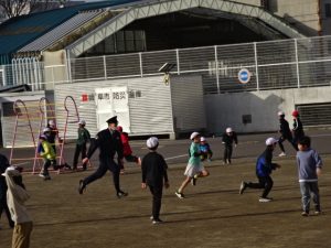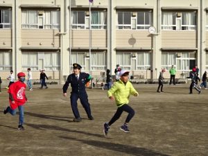 子どもたちも、警察チームと泥棒チームに分かれてゲームスタートです。広い運動場を、泥棒チームの子どもたちが、捕まらないように必死に逃げ回ります。