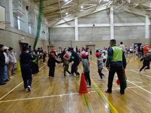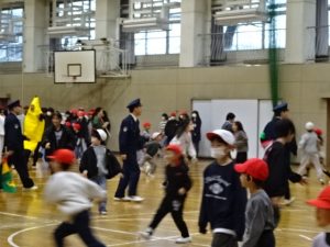 朝は、リアルけいどろの2日目、対象は1年生と6年生でした。あいにくのお天気で、今日は体育館で行いました。運動場よりも狭い場所なので少し心配でしたが、今日も楽しく活動させていただきました。