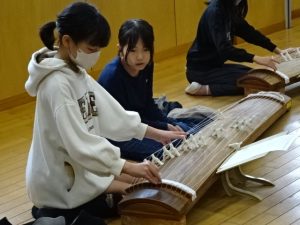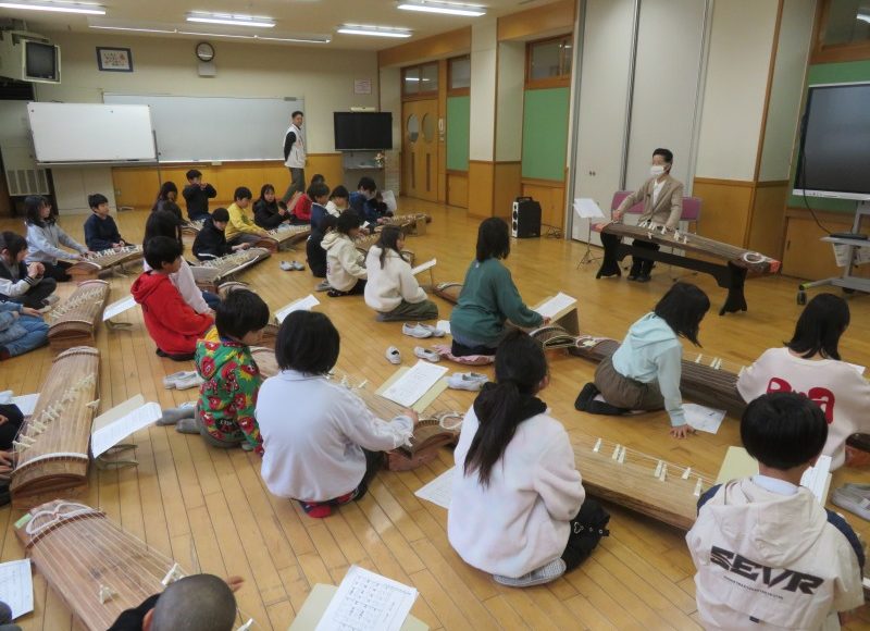 木製の長い胴に13本の弦が張られていて、指にはめた琴爪で弦をはじいて音を出します。琴の楽譜は、音楽の教科書で居慣れている楽譜とは違って、糸名や演奏記号が、縦書きで書かれています。その読み方を教えていただいて、「さくらさくら」をみんなで演奏しました。初めての経験の子がほとんどだったと思いますが、先生に丁寧に教えていただいたおかげで、すてきな演奏になりました。ありがとうございました。