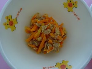 <アイデア賞に選ばれたメニュー:キャロットラペ> フランスの料理です。普通はオリーブオイルで作りますが、今日のラペは、ごま油を使って和風にアレンジしてありました。考えたメニューでは、食感を楽しめるように「さきいか」を入れましたが、給食ではみんなが好きなツナが入って食べやすくしてありました。