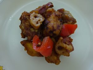 <優秀賞に選ばれたメニュー:夏野菜ポーク南蛮> 夏の暑さに負けず、さっぱり食べることができて、疲れも取る「酢」を使ったメニューです。今の季節に合わせて、今日は「ナスとオクラ」を「レンコンとサツナイモ」に代えて提供されました。