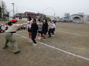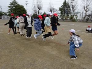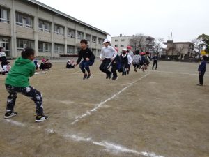 5年生は、大縄大会を行っていました。長い縄に大勢の仲間が同時に入って縄を跳びます。運動場からは、「1,2,3,・・・」と元気のいいかけ声が聞こえていました。