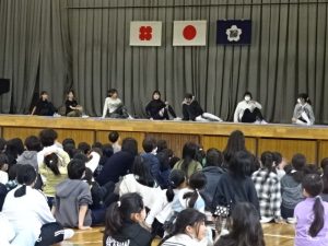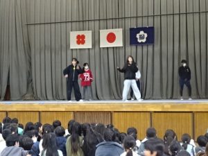 ダンスクラブが、1年間の活動を通して練習してきたダンスを、昼休みに体育館で発表しました。体育館には、ダンスクラブでがんばっている仲間の発表を楽しみに、たくさんの子どもたちが集まっていました。