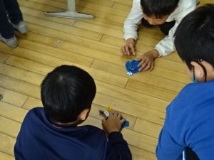 3年生は、1年間の理科の学習のまとめとして、実験キットで作ることができる「シューティングゲーム」を作って楽しみました。説明書を見ながら作るのは苦手な子が多いのですが、今は、説明書にQRコードが載っていて、タブレットで読み込めば動画で作り方を見ることができます。すごいですよね~。作った子から、早速友だちと遊んでいました。