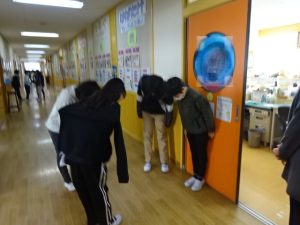 また、美化委員会からの提案で、いつも行っている全校掃除も、今日から少しだけ方法が変わりました。「美しくするための掃除」を目指して、時間になったら各掃除場所の廊下に道具を持って整列(輪になる)し、「はじめます!」のあいさつで掃除をスタートさせます。一緒に掃除をする仲間と顔を合わせてあいさつをするだけで、「みんなでこの場所をきれいにするぞ!」という気持ちが高まります。終わった後にも、再び輪になって「終わります!」のあいさつ。時間いっぱいがんばった自分達をお互いに認め合うことができるすてきな時間となりました。
