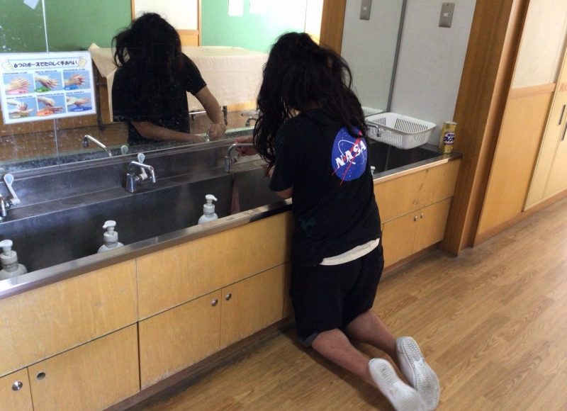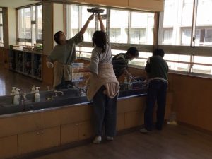 手洗い場のシンクについた水垢汚れも力を込めてゴシゴシ磨いてくれました。また、鏡もピカピカでした。低学年が使用するトイレは、どうしても汚れやすいのですが、そこもブラシでしっかりとこすってきれいにしてくれていました。他にも、廊下や階段など、汚れを見つけて時間いっぱい美化活動に取り組んでくれました。6年生のみなさん、きれいにしてくれてありがとう!