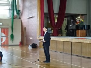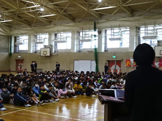 校長先生の話。今日子どもたちが受け取った通知票に書かれた担任の先生からの所見の中から、2つを紹介されました。1つは「台上前転が怖かったけど。諦めずに練習を繰り返した」というもの。この子の姿を通して一歩踏み出す勇気と、自分の可能性を信じてがんばることの大切さを話されました。2つめは「重たい牛乳かごを持っていた子に、一緒に持つよと声をかけた」といういもの。思いやりの心と相手の気持ちに気付いて行動した素晴らしさについて話されました。でも、場面は違っても、この所見と同じような状況って経験した子がたくさんいたと思います。学校や学年が変わっても、新しい環境でこういうことをずっと大切にしていけるとよいですね。