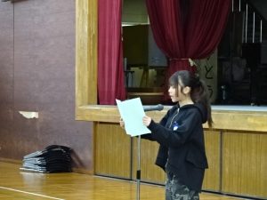 児童代表の言葉。5年生としてがんばったこととして3つの話をしました。1つめは「やなっこ集会」です。全校の前で友だちとダンスを踊った経験を話していました。2つめは野外学習。みんなで作ったカレーライスは今まで食べたカレーのトップ5に入るおいしさだったそうです。3つめは委員会活動。全校の子のことを考えて高学年として取り組んだ経験は、最高学年になる次年度にも活かせそうですね。6年生でがんばることは、算数や漢字の学習と異学年との交流です。すでに4月からの生活を見通しているなんてすごいですね。最高学年、がんばって!!!