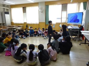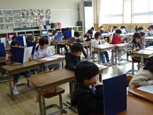 学級活動の様子です。1年生にとっては初めての年度末。担任の先生から、1人ひとりが「1年間でがんばったこと、できるようになったこと」について話をされていました。そして、初めての通知表。二重丸がいくつあるか数えていました。にっこり笑顔だったのは、たくさんあったからかなぁ。