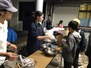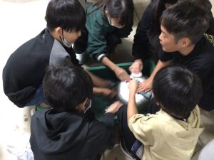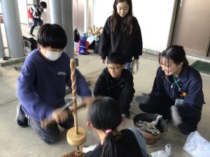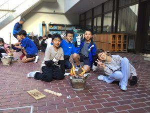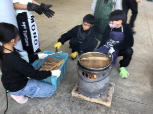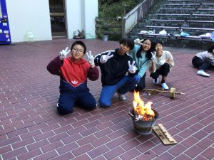火おこし体験をしました。リズムよく動かすのは難しいですが、今年の5年生はなんだかみんな上手でした。火種を作れたら優しくふぅーっと息を吹きかけてほお尾を大きくします。どの班もちゃんと火を起こすことができました。