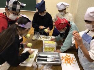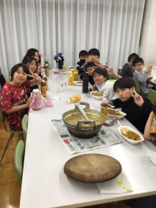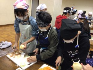 野外炊事です。あじさい広場で実施できなくなってしまったので、今日は、みんなでビーフカレーだけを作りました。野菜がしっかりと柔らかく煮えるように小さく細かく切りました。