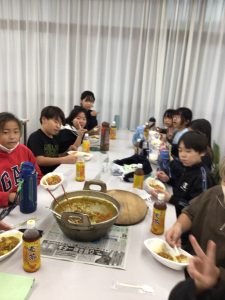 かまど係が火をつけてくれたかまどでぐつぐつ煮込んで完成です。あたり一面にカレーのいい香りが漂っていました。