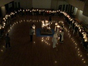 キャンドルサービスを行いました。火の神と火の子が入場し、1人1人が持つキャンドルに順に火が灯されていきました。電気を消したホールの中にキャンドルの火だけがともり、とても幻想的でした。